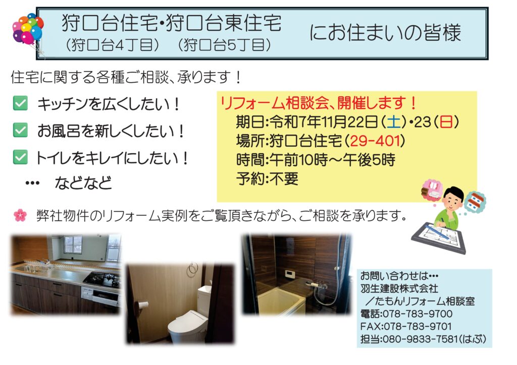 来る11/22(土)及び23(日)、10時から17時まで、狩口台住宅の弊社リノベ物件(29号棟401号室)で「リフォーム相談会」を開催します!